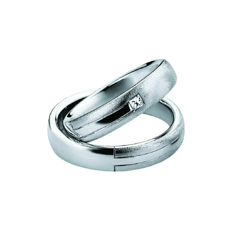 You’ll be reminded of the permanence of your love when you see these rings. Strong, bold and polished platinum, creating an unbreakable bond. Her sparkling diamond links them, two hearts beating as one.