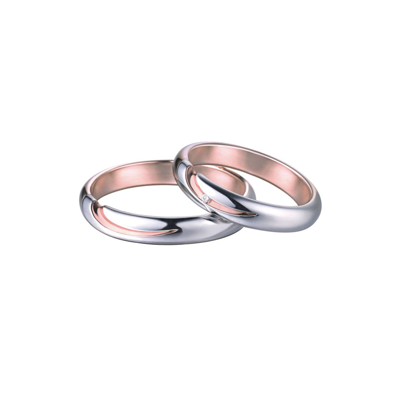 You’ll want to wear these rings forever, they’re so sweet and graceful. A swirl of rose gold adds color to the white gold band, a diamond in her ring adds passionate sparkle.
