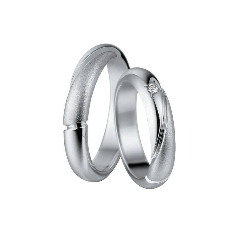 These rings express your deep love in perfect harmony. A pair of stunning rings, lustrous in white gold or platinum. A subtle diamond on hers creates sparkles that catch the eye.