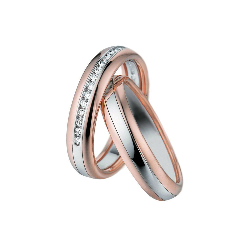These rings provide a perfect metaphor for your loving relationship. Stunning rose gold touching lustrous white gold, the meeting of two individual souls, just like yours. Her ring sparkles with a row of delightful diamonds.